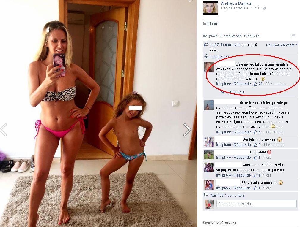 "Este incredibil cum unii părinţi îşi expun copiii pe Facebok. Părinţi, hrăniţi boala şi obsesia pedofililor! Nu sunt OK astfel de poze pe reţelele de socializare", a scris o prietenă virtuală de-ale vedetei la una dintre imaginile în care aceasta apare împreună cu fiica ei.