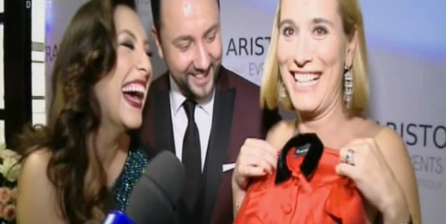 Andreea Esca a venit îmbrăcată într-o rochie roşie pe care a accesorizat-o cu o pereche de aripi. Ştirista a venit şi cu un cadou special pentru Eva Maria Ioana.