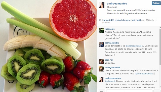 Dimineaţa pare să fie partea preferată din zi a Andreei Mantea, în ciuda faptului că nu se trezeşte cu cineva alături. La scurt timp după ce şi-a făcut trezirea, bruneta serveşte un mic dejun alcătuit din fructe şi legume şi este gata de o nouă zi energică!
