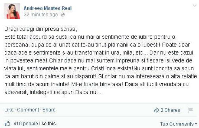 Chiar dacă relaţia de iubire între Andreea Mantea şi Cristi Mitrea s-a încheiat în urmă cu ceva timp, iată că povestea nu s-a încheiat în totalitate. Andreea a postat pe contul ei de socializare un mesaj adresat jurnaliştilor din presa scrisă în care susţine că sentimentele pentru fostul său iubit nu s-au stins în totalitate.