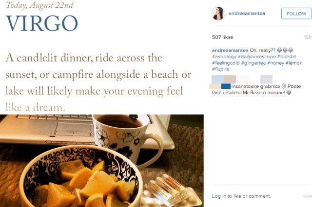 Bruneta a scris pe contul ei de Instagram, alături de o poza cu horoscopul ei de sâmbătă, că a răcit şi se tratează cu ceai îndulcit cu miere, cel mai probabil stând în pat.