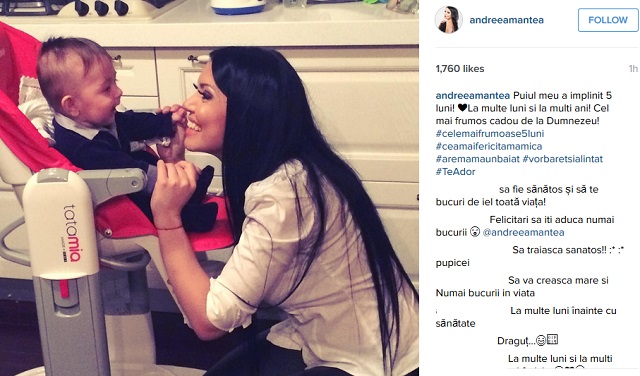 "Puiul meu a împlinit 5 luni! La multe luni şi la mulţi ani! Cel mai frumos cadou de la Dumnezeu. Cele mai frumoase 5 luni. Cea mai fericită mămică. Are mama un băiat vorbăreţ şi alintat. Te ador", este mesajul care însoţeşte imaginea postată de Andreea Mantea pe o reţea de socializare.