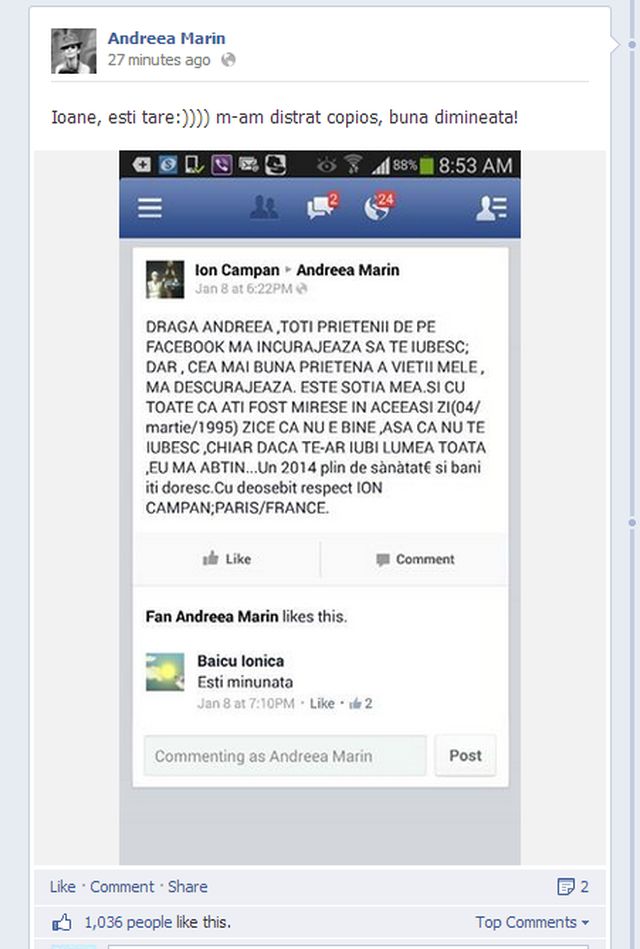"Ioane, eşti tare:)))) m-am distrat copios. Bună dimineaţa!", a scris Andreea pe site-ul de socializare Facebook.