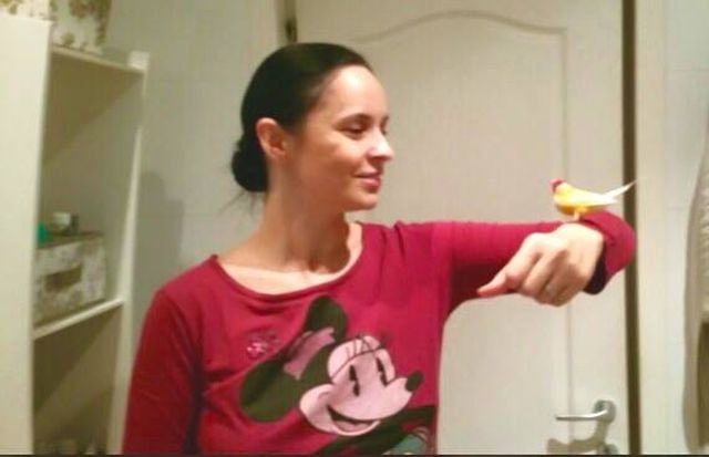 Cu o pijama de culoare roşie, cu imprimeu cu personajul animat Minnie Mouse, vedeta de televiziune s-a lăsat fotografiată în timp ce se juca, înainte de culcare, cu una dintre păsăricile pe care le are în casă.