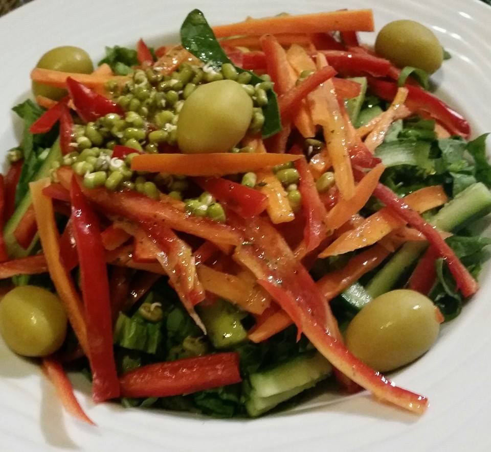 "Ce mâncare sănătoasă să alegem de pe masă? Avem sărmaluţe raw-vegan, "brânzică" de caju cu verdeţuri, pizza vegetariană fără aluat din făinoase, un desert minunat cu gust de "negresă" fără zahăr sau preparare termică şi... salata mea preferată! Să începem cu ... ultima. Conţine: rucola, spanac, ardei roşu sau gogoşar roşu dulce, castravete, fasole germinataă, măsline. Sosul e foarte important pentru a lega şi a da gust salatei: suc de lămâie proaspăt, ulei de măsline, sare de Himalaya (mult mai bogată nutritiv), mentă tăiată marunt, turmeric", a scris Andreea Marin pe contul său de socializare.