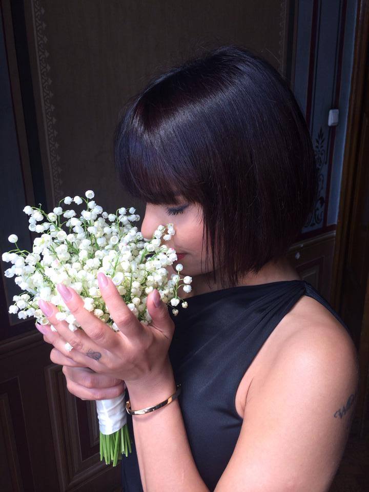 Vizibil afectată, Andreea Popescu a postat pe contul personal de Facebook o fotografie în care apare cu capul în jos, ochii închişi şi adulmecând un buchet de lăcrămioare.