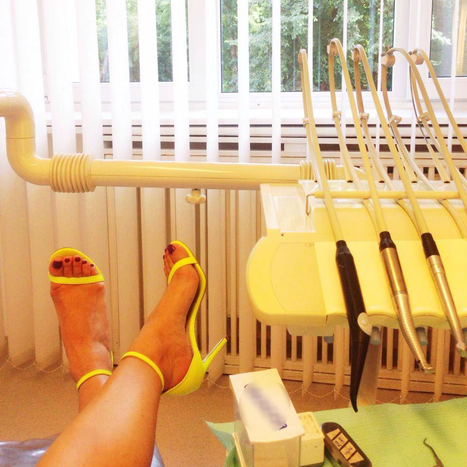 Teama s-a păstrat de-a lungul timpului, astfe că Andreea a mers cu inima strânsă la fiecare intervenţie pe care şi-a făcut-o la dinţi, fie ea medicală sau estetică. Lucrurile s-au schimbat radical astăzi, când bruneta a mărturisit că a fost prima dată când s-a simţit relaxată în scaunul pacientului, cu toate că ştia ce-o aşteaptă. Atât de calmă a fost, încât a simţit nevoia să imortalizeze momentul printr-o fotografie pe care şi-a făcut-o la picioare. "Nu credeam că o să ajung să fiu atât de relaxată la dentist încât să fac poze:-) şi ce frică îmi era încă din copilărie", a scris fosta prezentatoare pe contul ei de Facebook. Nu ştim exact dacă Andreea a vrut să demonstreze că e complet lipsită de teamă sau a vrut să le arate prietenilor sandalele sale de un galben-fosforescent care se văd în toată splendoarea în această imagine.
