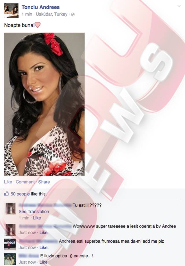 Andreea Tonciu a mers zilele trecute în Turcia, unde şi-a efectuat operaţia de micşorare a nasului. Mândră de intervenţie, vedeta a postat pe o reţea de socializare o fotografie cu noua "achiziţie". Admiratorii Andreei Tonciu au fost impresionaţi de schimbare şi i-au mărturisit că le-a fost greu să o recunoască.