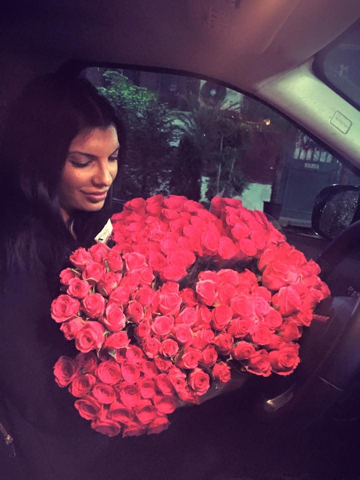 În imagine, Andreea Tonciu se bucură de primirea unui buchet imens de trandafiri roşii.