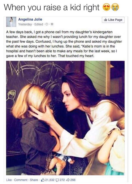 "În urmă cu câteva zile, am primit un telefon de la educatoarea fiicei mele. M-a întrebat de ce fiica mea nu are pachet pentru masa de prânz la ea în ultimele zile. Confuză, am luat telefonul şi mi-am întrebat fiica ce a făcut cu prânzul ei. Mi-a spus: "Mama lui Katie este în spital şi nu a putut să-i facă nicio masă în ultima săptămână, aşa că i-am dat câteva dintre pacheţelele mele". Asta mi-a atins inima", a scris Angelina Jolie pe o reţea de socializare.