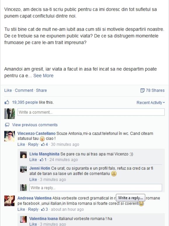 "Impresionat" de ceea ce scrisese Antonia în postarea de vineri după amiază, dedicată fostului soţ, utilizatorul de Facebook "Vincenzo Castellano" i-a răspuns Antoniei: "Scuze Antonia, mi-a căzut telefonul în wc. Când citeam statusul tău. Ciao!"
