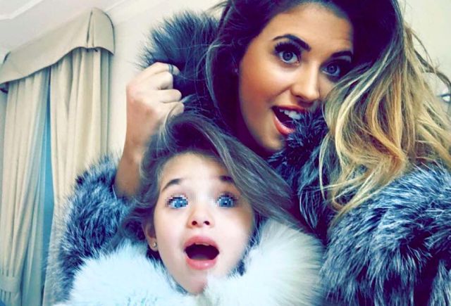În imagine, Maya pozează alături de mama ei, mimând surprinderea. Fetiţa urmează stilul vestimentar al mamei ei şi poartă ca şi aceasta haină de blană albă.