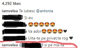 Deci, există cel puțin încă un bărbat care o iubește pe Antonia, fapt deloc surprinzător, ar spune unii. Alex Velea, însă, pare să nu aprecieze aceste exprimări, oferind o replică acidă prietenului virtual.