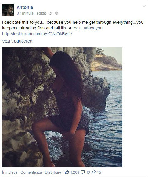"Îţi dedic această fotografie pentru că mă ajuţi să trec cu bine prin toate greutăţile şi mă menţii puternică şi înaltă, precum o stâncă", a spus Antonia.