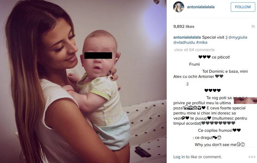 Antonia a postat pe o reţea de socializare o fotografie cu băieţelul bunei ei prietene, Giulia. În imagine, Antonia este vrăjită de gingăşia bebeluşului de patru luni.