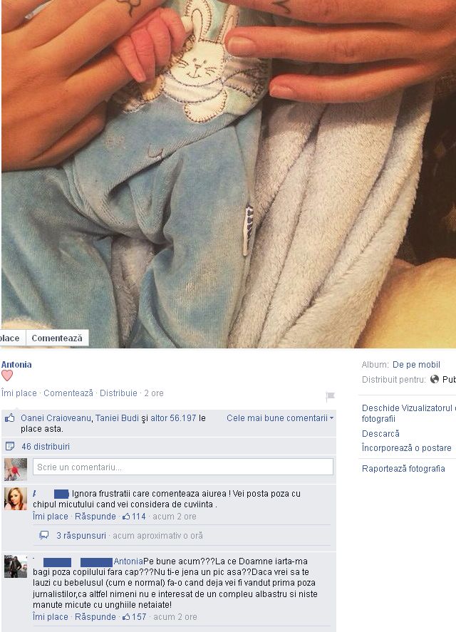 "Pe bune acum? La ce, Doamne iartă-mă, bagi poza copilului fără cap? Nu ţi-e jenă un pic aşa? Dacă vrei să te lauzi cu bebeluşul (cum e normal), fă-o când deja vei fi vândut prima poza că altfel nimeni nu e interesat de un compleu albastru şi nişte mânuţe micuţe şi cu unghiile netăiate", i-a scris o fană înfuriată.