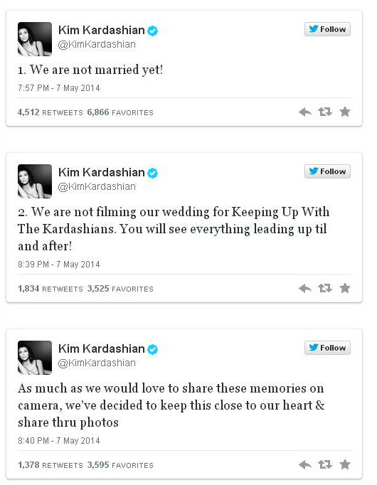 Din cauza zvonurilor lansate în media, Kim a simţit nevoia să îşi exprime părerea în mod public, vizavi de nunta sa şi a lui Kanye. Anunţul a fost făcut pe Twitter, iar vedeta şi-a rugat fanii să nu mai ia în serios fotografiile false cu ea în timp ce poarta ă rochie de mireasă şi amănuntele privind ceremonia lor religioasă. Ceea ce a stârnit uimirea tuturor a fost faptul că focoasa brunetă nu va avea nunta televizată, în cadrul reality-show-ului "Keeping up with the Kardashians"