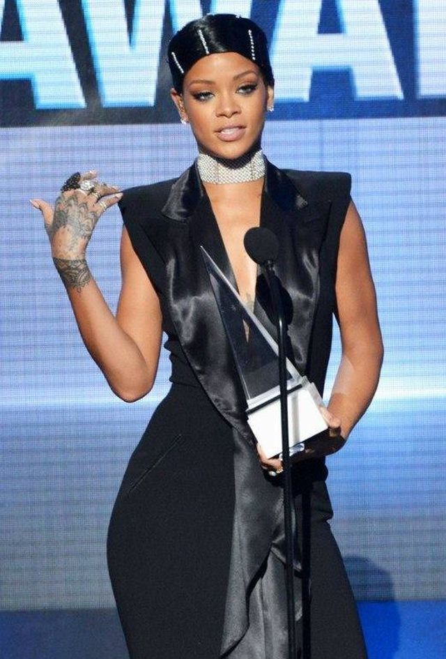 Rihanna a reuşit să-şi uimească admiratorii şi de data asta, aceasta s-a urcat pe scenă într-o rochie neaşteptat de elegantă, faţă de cum ne-a obişnuit. Rochia neagră mulată, însă suficient de decoltată încât să i se vadă tatuajul de sub sâni, a reuşit să-i pună corpul în valoare. Rihanna şi-a accesorizat rochia cu un colier. Părul l-a avut prins şi accesorizat cu trei agrafe în ton cu colierul.