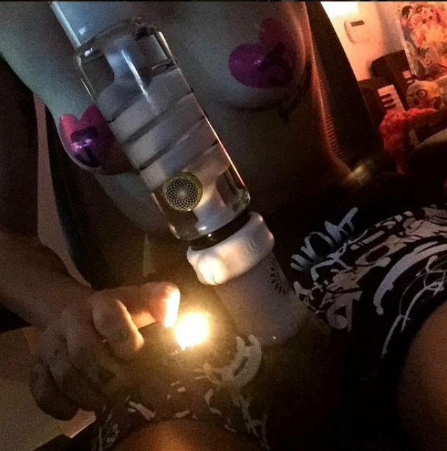 Cântăreaţa s-a fotografiat la sânii goi şi cu sfârcurile acoperite de două inimioare, iar între picioare ea a ţinut un bong, o pipă pe bază de aburi, folosită în consumul de cannabis.