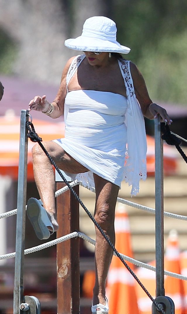După plajă, vedeta şi-a pus o rochie albă, scurtă, care i-a evidenţiat şi mai tare picioarele cu pielea lăsată.