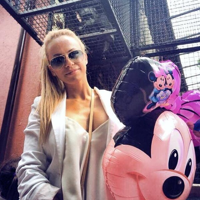 Anda Adam s-a pozat cu un balon mare în braţe în formă de Mickey Mouse şi după zâmbetul pe care îl afişează, balonul este primit de la iubitul ei, Cătălin Ţîră.