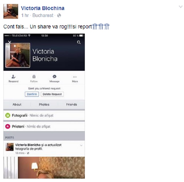 Vedeta a postat anunţul pe pagina sa de Facebook în urmă cu puţin timp. Un utilizator virtual şi-ar fi creat un cont de Facebook fals cu numele şi pozele Victoriei Blochina. Aceasta a sesizat şi a postat o captură a ecranului cu profilul de Facebook intrus.