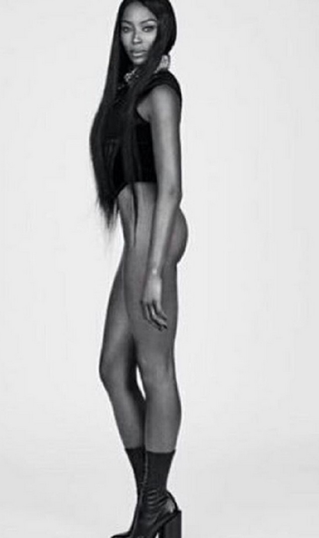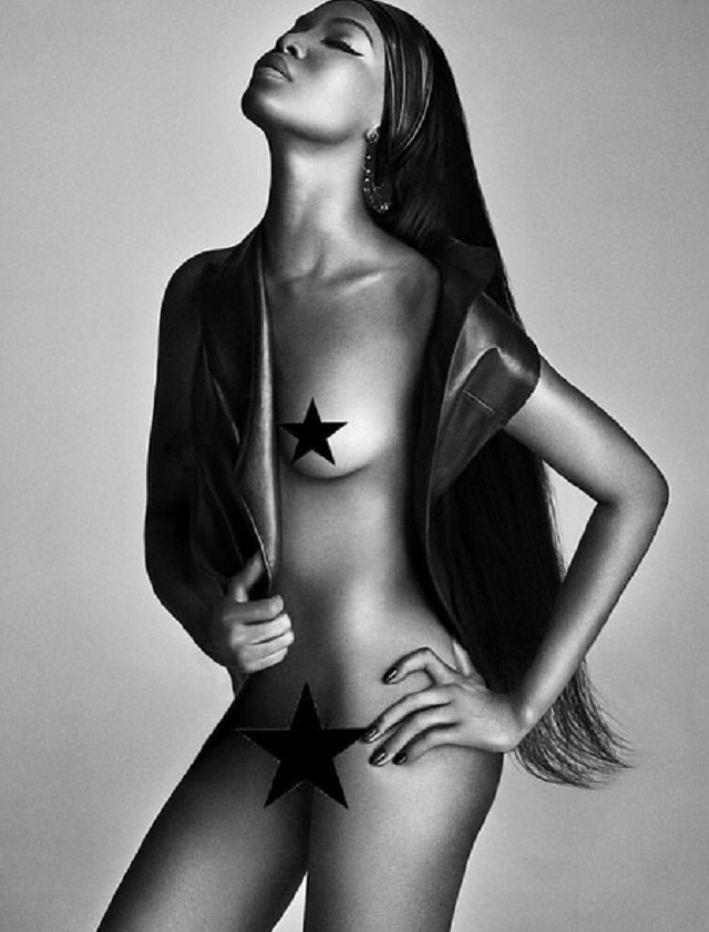 În imagini, o puteţi vedea pe Naomi Campbell complet dezbrăcată, dar şi-a acoperit sfârcurile şi zona intimă cu nişte steluţe. Fotografiile au strâns sute de mii de like-uri.