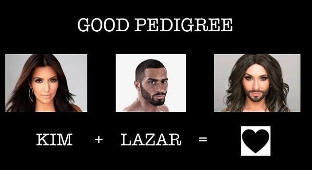 Glumele n-au întârziat să apară după ce Conchita Wurst a câştigat concursul Eurovison, femeile au început să-şi deseneze barbă, iar bărbaţii să se bărbierească. Ei bine, cineva s-a gândit de unde a apărut acest personaj şi l-a asemănat pe travestit cu artista Kim Kardashian şi culturistul Lazăr Angelov.