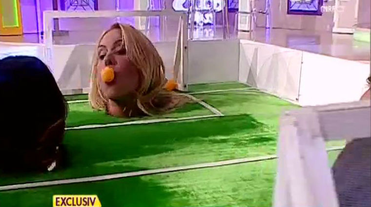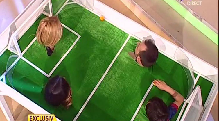 Cei patru şi-au pus capetele la bătaie, căci regulile acestui joc au fost diferite! Împărţiţi în echipe de câte 2 persoane, ei au trebuit să marcheze la poarta oponentului fără să se folosească de mâini. Singura modalitatea prin care puteau face acest lucru a fost să sufle cu putere în mingea de plastic.
