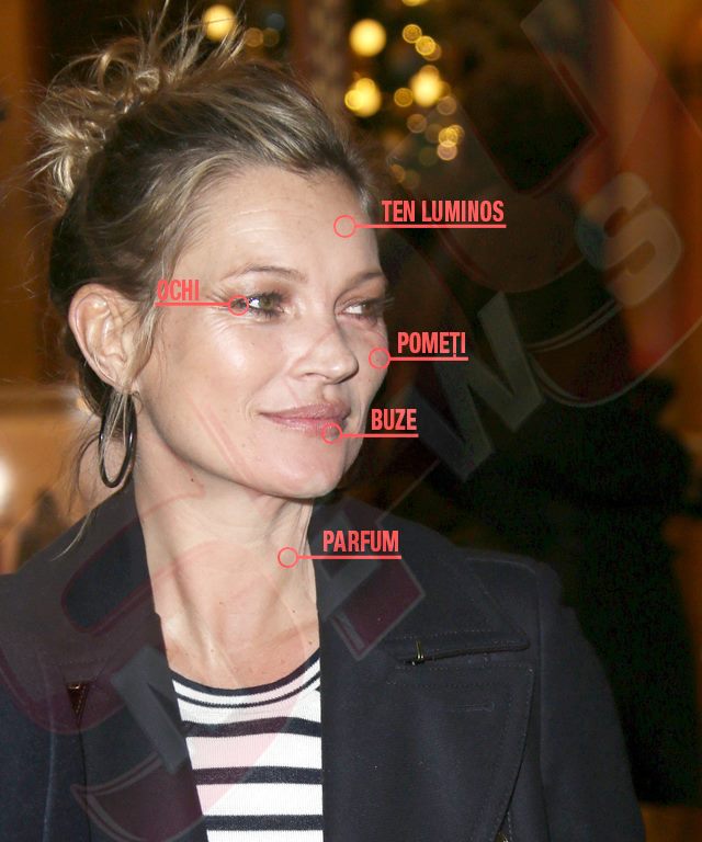 "Pentru un ten luminos, folosesc drenaj limfatic pentru care foloseşte un serum facial, care funcţionează ca un facelift natural. Pomeţii - îmi place să mixez nuanţele de auto-bronante cu ajutorul cărora accentuez conturul pomeţilor, evidenţiindu-i. Pentru ochi folosesc mereu creion creion de ochi. Trasez o linie subţire, după care aplic un fard de ploape discret. Rujul roşu este soluţia ideală pentru un party-look . Este frumos să ai o faţă naturală, ochi strălucitori şi buze electrice, pentru un plus de culoare. Parfum - Pentru această perioadă din anului, preferă aromele "moodler", care o fac să se simtă specială", a mărturisit Kate Moss.