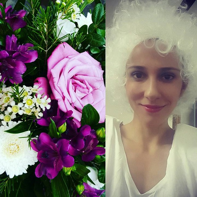 "Mi-am început aniversarea zilei de naştere pe scena Teatrului de pe Lipscani. La finalul spectacolului mi-au făcut o surpriză minunată: mi-au adus acest buchet de flori şi mi-au cântat toţi actorii de pe scenă şi toţi cei din public <<La mulţi ani>>. P.S. Uite că la 30 de ani mi s-a albit părul de tot. Poza e făcută cu câteva minute înainte de a intra pe scenă", a scris Dana Rogoz, la descrierea imaginii de pe Facebook.