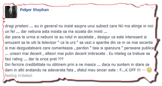 Sătui să o asculte lovind cu vorbe grele în stânga şi în dreapta, nu puţini au fost cei care au răbufnit împotriva ei. Însă cea mai devastatoare reacţie a venit din partea unuia dintre cei mai discreţi şi calmi designeri, Stephan Pelger. Teribil de iritat de comentariile Iuliei, Pfelger şi-a ieşit din minţi şi a făcut o postare nimicitoare care o viza, pe un site de socializare. "Nebună", "dezgustătoare" au fost doar câţiva dintre termenii pe care i-a folosit la adresa ei şi şi-a încheiat "prelegerea" cu un scurt "F...k off!".