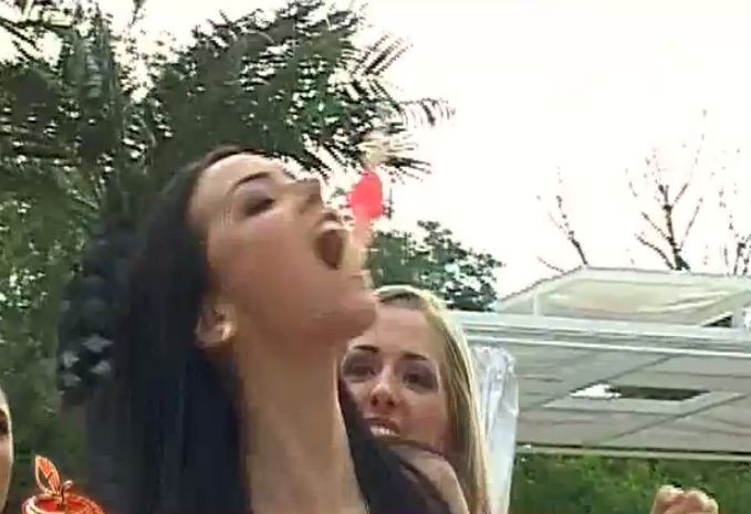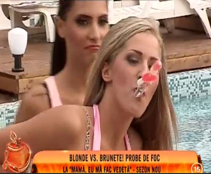 În bătălia blonde vs. brunete, fetele au trebuit să muşte o aţă plină cu jeleuri şi să mănânce cât mai multe din dulciurile colectate în "luptă".