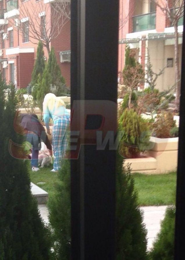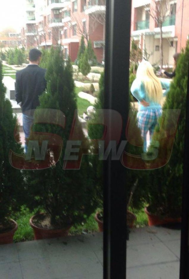 În prima poză, Victor o însoşeşte pe Lena afară, stă relaxat semn că se simte bine în compania ei. În imagine se vede că focoasa blond, fostă prezentatoare TV, este îmbrăcată în pijamale.
