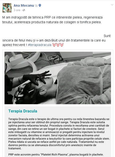 "M-am îndrăgostit de tehnica PRP ce întinereşte pielea, regenerează ţesutul, acelerează producţia naturală de colagen şi tonifică pielea. Sunt sincera de felul meu şi v-am dezvăluit unul din tratamentele la care eu apelez frecvent!", le-a mărturisit Ana Mocanu prietenilor ei virtuali.