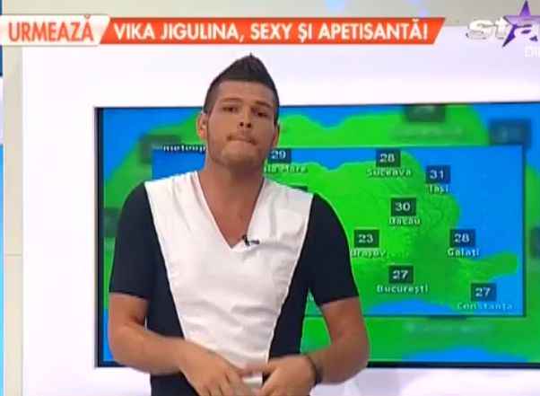 Distrat de modul în care prezintă bruneta rubrica meteo, Bote a imitat-o pe aceasta tachinând-o cu tot felul de gesturi.
