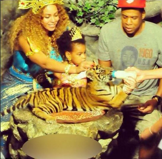 În altă imagine, Beyonce şi Jay Z apar în timp ce hrănesc, împreună cu fetiţa lor, un pui de tigru.