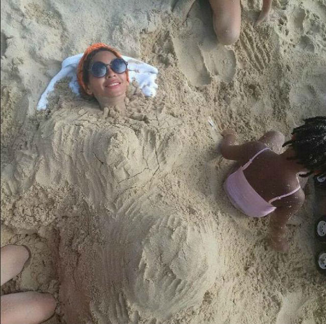 Cea mai surprinzătoare imagine, este cea în care artista apare îngropată în nisip până la gât. Asta nu e însă tot! Un mic detaliu sare în evidenţă atunci când priveşti poza. Nisipul conturează o burtică de gravidă. Oare Beyonce este însărcinată din nou? Tu ce crezi?