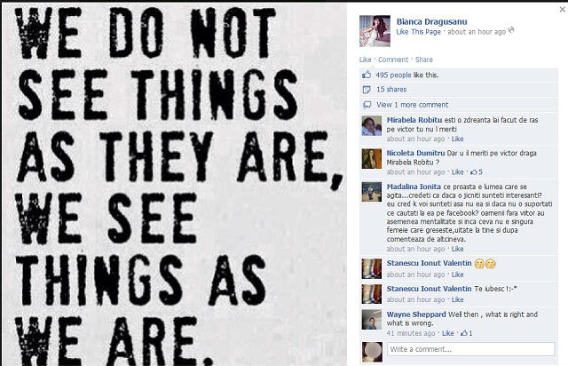 A simţit, probabil, nevoia să interacţioneze mai mult cu prietenii virtuali, aşa că le scrie acestora cugetările sale despre iubire, optimism şi viaţă în general. "Nu vedem lucrurile aşa cum sunt ele, ci le percepem în funcţie de cum suntem noi", a scris Bianca, de data asta, pe contul ei de socializare. Deşi mulţi au apreciat mesajul, au fost şi câţiva fani care au criticat-o dur. "L-ai făcut de râs pe Victor, nu-l meriţi", i-a scris unul dintre ei.