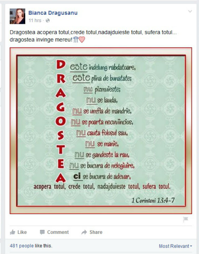 Frumoasa Bianca Drăguşanu a postat recent pe Facebook un mesaj din ... Biblie. Roşcata n-a precizat cui îi este adresat acest text, dar mesajul este cât se poate de "explicit": "Dragostea acoperă totul, crede totul, nădăjduieşte totul, suferă totul... dragostea învinge mereu!". Alături a postat un citat din cartea sfântă, dintr-o epistolă către corinteni.
