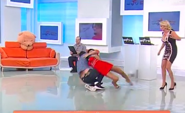 Până aici, momentul era chiar mai spectaculos decât cel din film. Bote a luat-o pe sus pe Raluca şi a învârtit-o de mai multe ori în aer. La finalul dansului, însă, prezentatorul s-a dezechilibrat şi a căzut cu tot cu Raluca Dumitru, stârnindu-i Rocsanei Marcu hohote de râs. Cei doi "dansatori" au tras o trântă atât de amuzantă, că nici dacă ar fi regiozat-o nu le-ar fi ieşit aşa. Spre deliciul bărbaţilor, Raluca a oferit şi o privelişte sexy când era întinsă pe podea. Rochia,şi aşa scurtă, i s-a ridicat mai sus pe coapse. Emisiunea "Star matinal" poate fi urmărită în fiecare dimineaţă, de la ora 9:00, numai la Antena Stars.