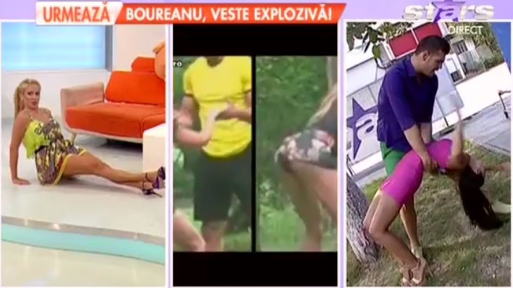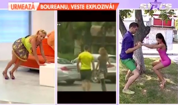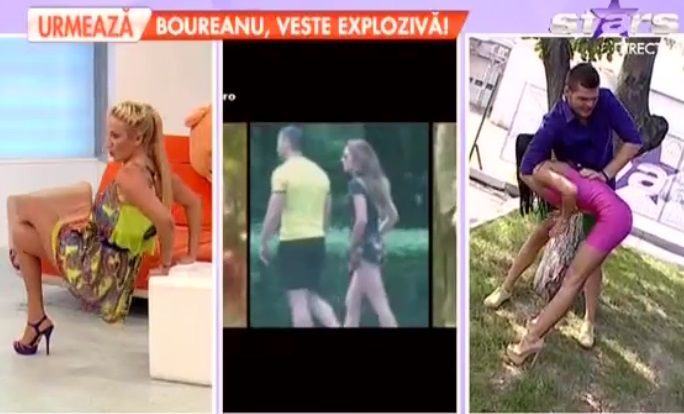Bote a ajutat-o galant pe Raluca Dumitru să execute câteva exerciţii de inviorare. Raluca a reuşit performanţa de a face genoflexiuni pe tocuri şi chiar şi podul din picioare.