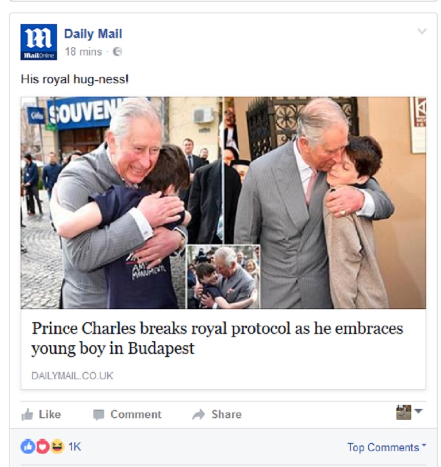 Ştirea era despre o îmbrăţişare pe care Prinţul Charles i-a oferit-o unui copil, în cadrul vizitei sale la Bucureşti, "încălcând" astfel protocolul.