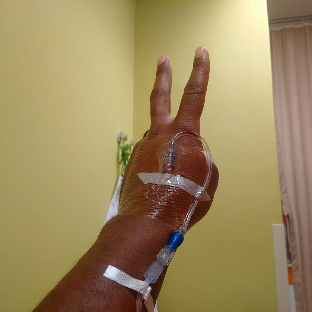 Prezentatorul TV şi-a împărtăşit suferinţa cu prietenii virtuali, cărora le-a postat mai multe fotografii pe o reţea de socializare. In imagini, vedeta stă pe patul de spital, aşteptând ca perfuzia să-şi facă efectul şi sperând ca amigdalele să cedeze de data aceasta.