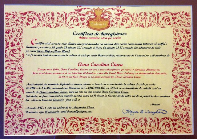 "Draga mea fetiță, Elena Carolina, fiecare om are o stea călăuzitoare pe care i-o dăruiește Dumnezeu. Tu o să ai două, pentru că și eu, tatăl tău, îți dăruiesc o stea din Carul Mare și îți urez să strălucești în viața asta în tot ce vei face. Steaua se va numi asemeni ție, Elena Carolina Ciucu”, este mesajul pe care designerul i-l transmite fiicei sale, inscripționat pe certificatul de proprietate.