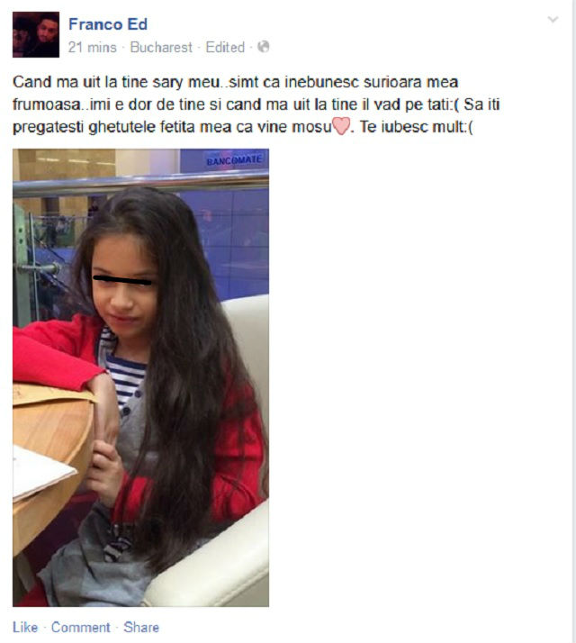"Când mă uit la tine, Sary meu... simt că înnebunesc, surioara mea frumoasă. Îmi este dor de tine şi când mă uit la tine îl văd pe tati. Să îţi prgăteşti ghetuţele, fetiţa mea, că vine Moşu'. Te iubesc mult", a scris Franco, pe Facebook.