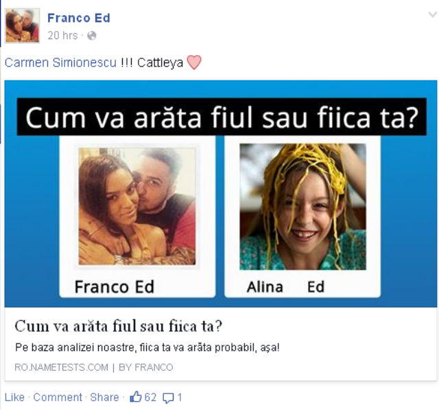 Cei doi se iubesc aşa de tare, încât conform ultimelor postări se gândesc şi la un copil. Franco a share-uit pe pagina lui Carmen un test prin care îi spunea cum o să arăte eventualul lor copil. Nu s-au oprit aici, căci Franco s-a gândit şi la un nume. "Cattleya", se pare că este cel preferat de iubitul lui Carmen.