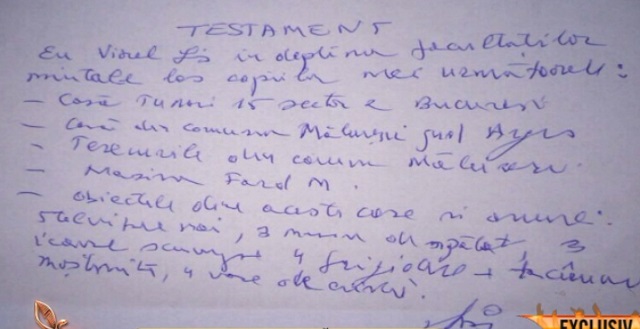 "Eu Viorel Lis, în deplinătatea facultăţilor mintale, las copiilor mele următoarele: casa din Tunari, casa din comuna Mălureni, terenurile din comuna Mălureni, maşina, obiectele din aceste case şi anume: 5 televizoare noi, 3 maşini de spălat, 3 icoane scumpe, 4 frigidere etc",