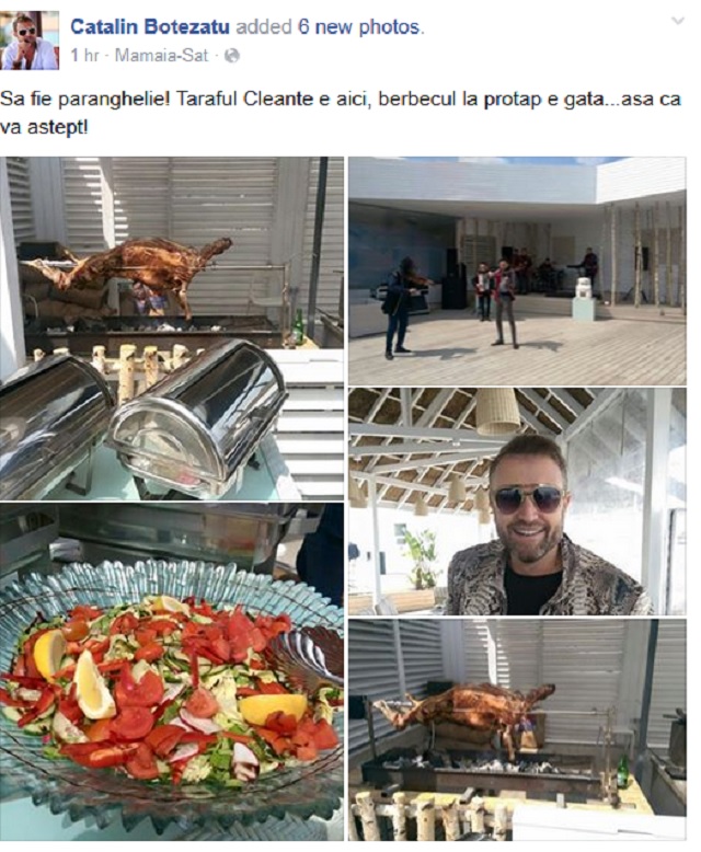 "Sa fie paranghelie! Taraful Cleante e aici, berbecul la proţap e gata, aşa că vă aştept", a scris Cătălin Botezatu la fotografiile aferente, în care se poate observa berbecul fraged, salata delicioasă de legume şi taraful pus pe cântec.
