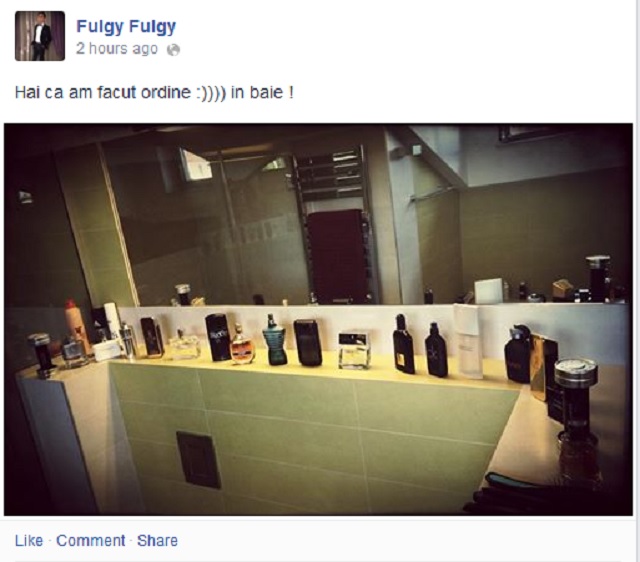 Când totul a ajuns la locul lui, fiul Clejanilor a făcut o poză pe care a publicat-o, apoi, pe Facebook ca să le arate şi prietenilor lui cum arată locul "unde şi regele merge singur". Sub oglinda mare stau, frumos aranjate, nenumărate sticle de parfum, la o distanţă mare una de alta. "Vreau şi eu un parfum, Fulgy", i-a comentat o amică, în timp ce alţi prieteni l-au criticat spunându-i că, prin această poză, a vrut doar să se laude că are multe parfumuri.